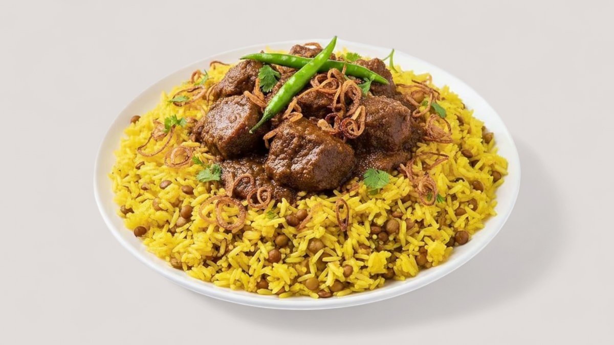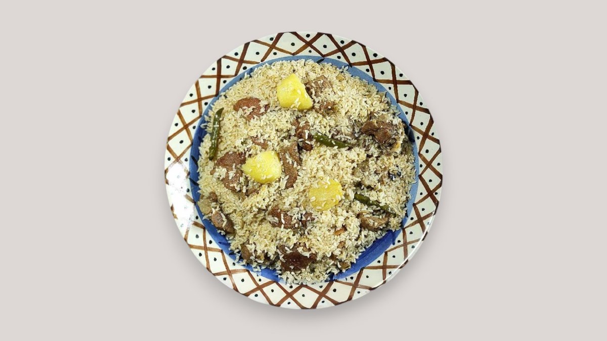 Gule ris tilberedt med halal-oksekød, sennepsolie og traditionelle krydderier. Fyldig smag med let styrke.