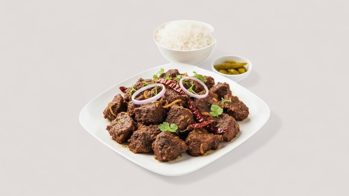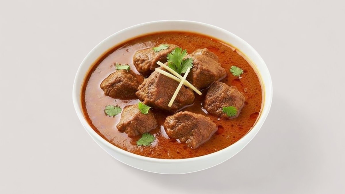 Mørt halal-oksekød tilberedt i en tyk, løgbaseret sauce med traditionelle krydderier. Serveres med ris.