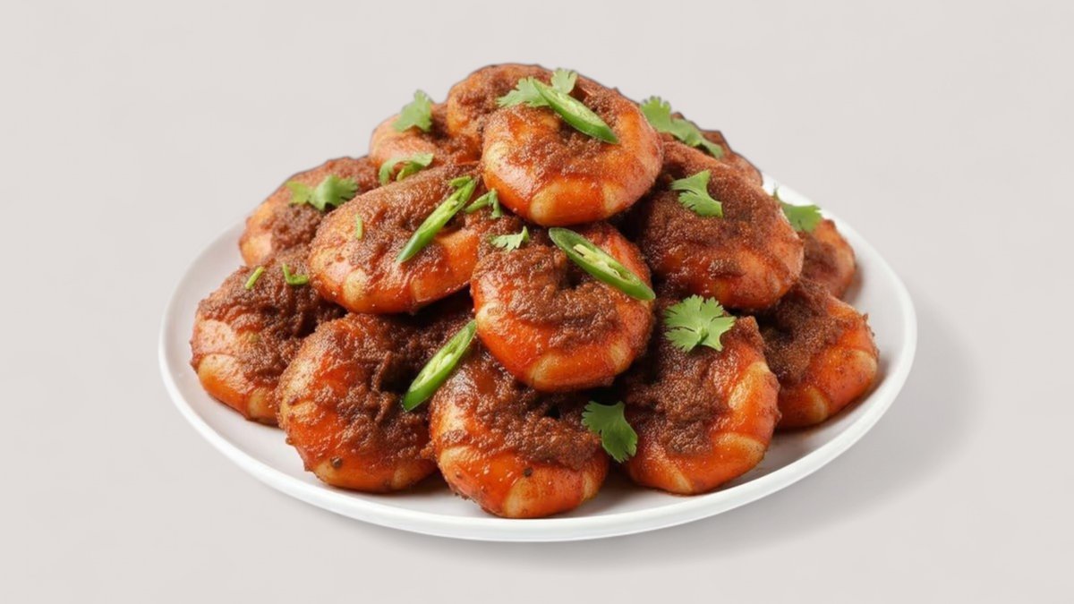 Saftige rejer tilberedt i en krydret, løgbaseret sauce med traditionelle krydderier.