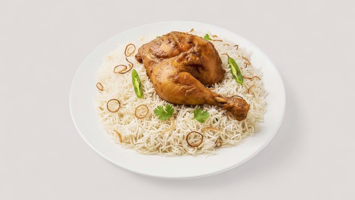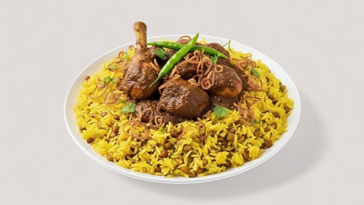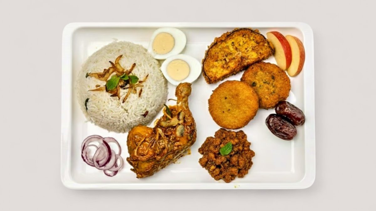 Et komplet Iftar-måltid med duftende ris, krydret kyllingelår, kogt æg, sprøde snacks, beguni, chola, frisk salat, æbleskiver og søde dadler. Perfekt afbalanceret, frisk tilberedt og lavet til at bryde din faste med tilfredshed.