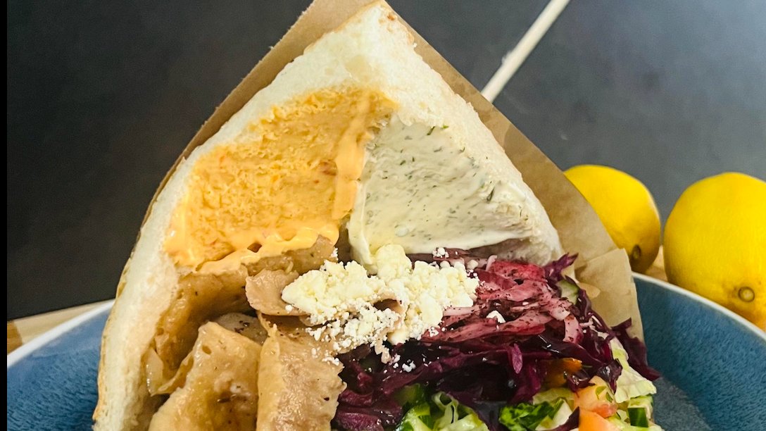 Stort hjemmebagt pida-brød med fyld af kylling, feta-ost, iceberg, tomat og agurk vendt med persille, rødløg, rødkål og valgfrie hjemmelavede dressinger.