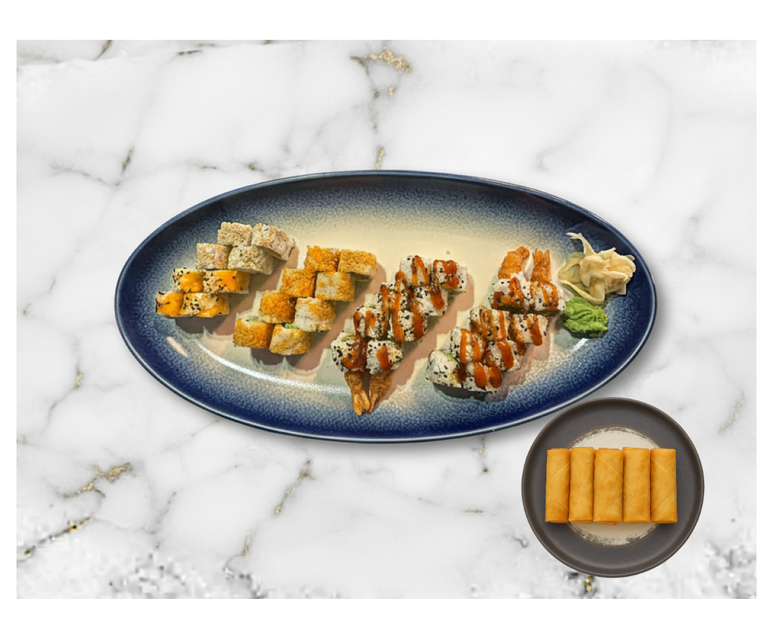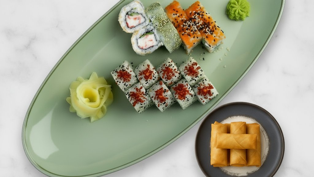 Gratis soya, wasabi og ingefær følger med i passende portion.