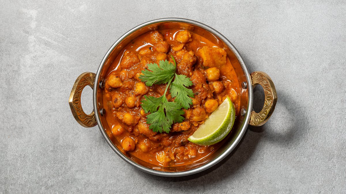 Kartofler og kikærter simret i en rig, krydret tomat og løgsauce, afsluttet med aromatisk garam masala. Serveres med ris.