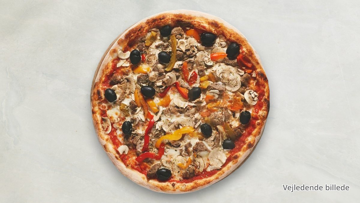 Tomatsauce, mozzarella, champignon, artiskok, oliven, paprika, løg og ananas.