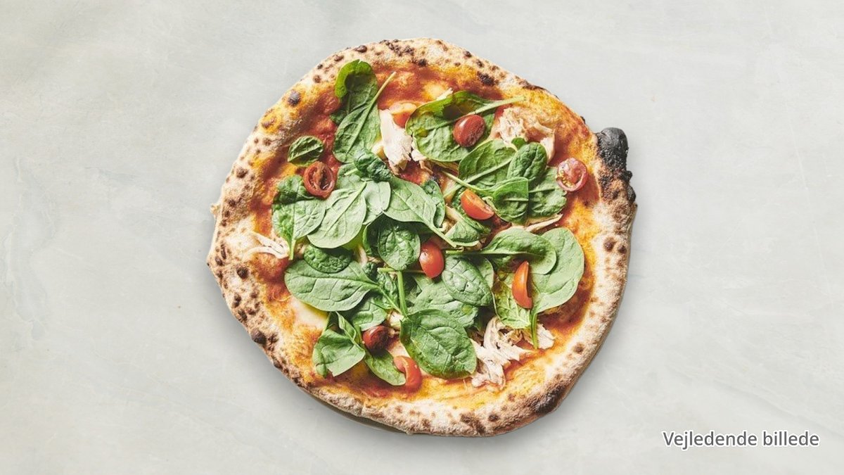 Tomatsauce, mozzarella, spinat, kylling og semidried cherry tomater.