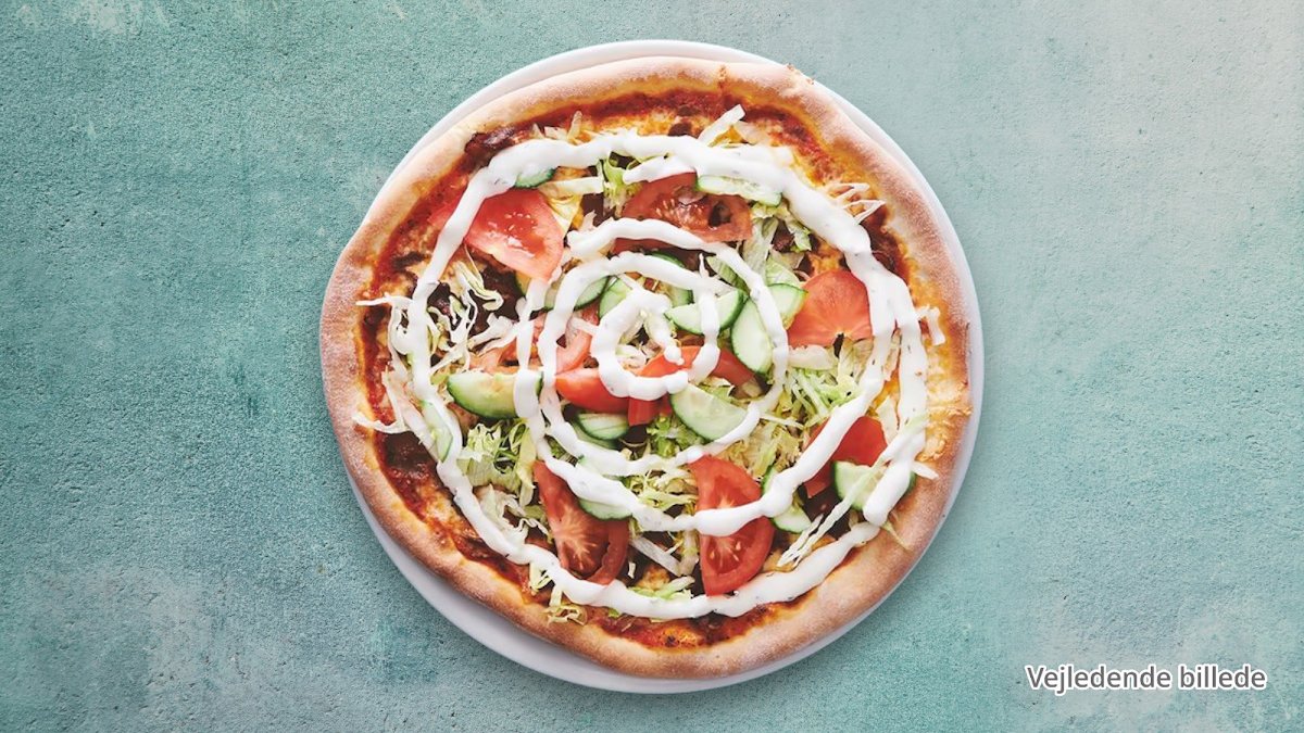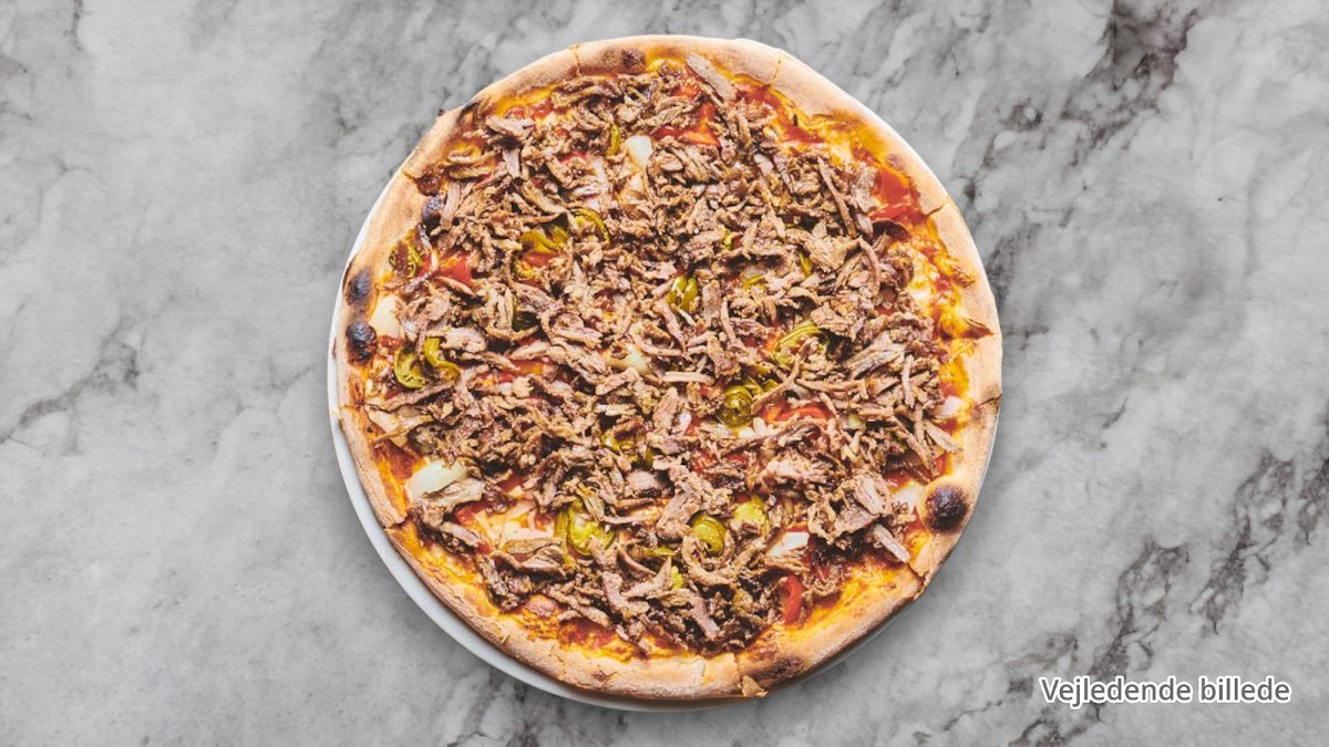 Tomatsauce, mozzarella, kebab, champignon og jalapeños.