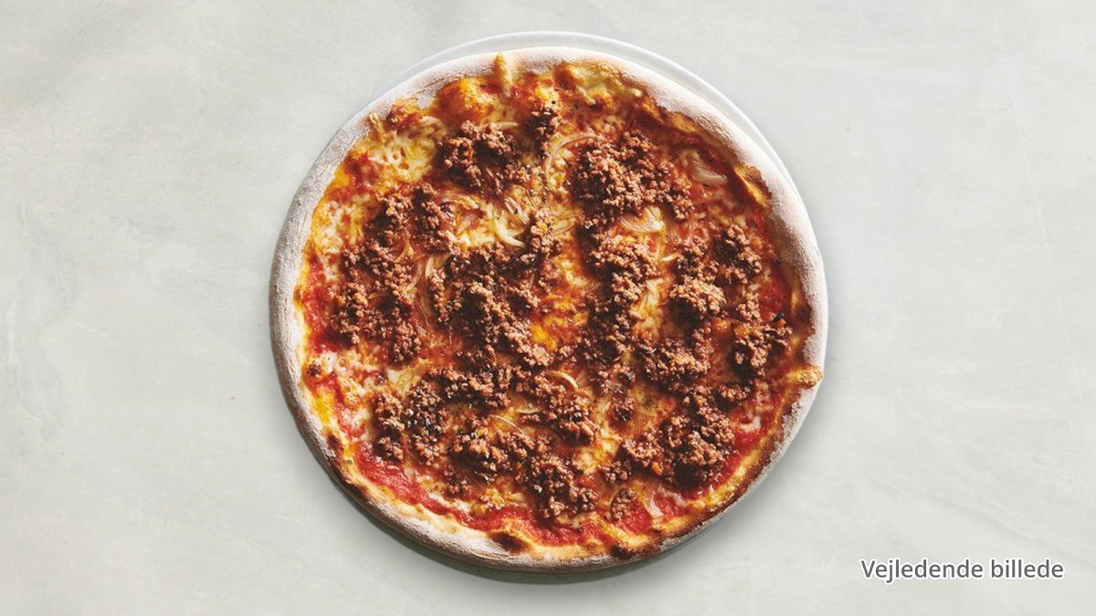 Tomatsauce, mozzarella, kødstrimler, champignon og løg.