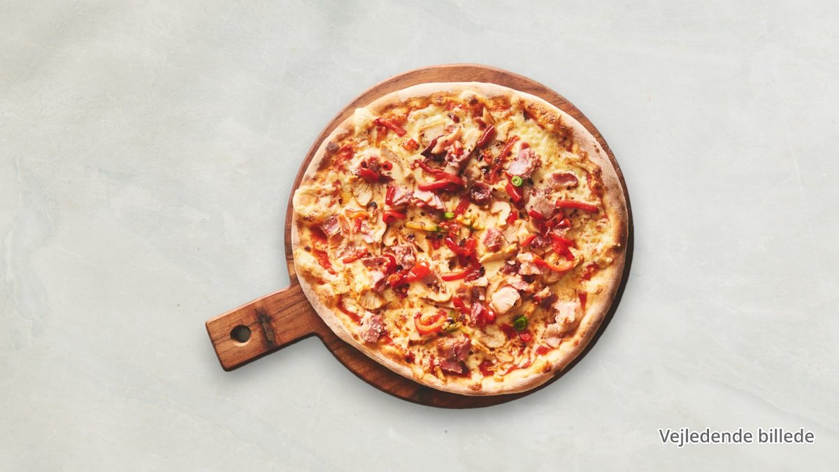 Tomatsauce, mozzarella, kylling, bacon og cocktailpølser.
