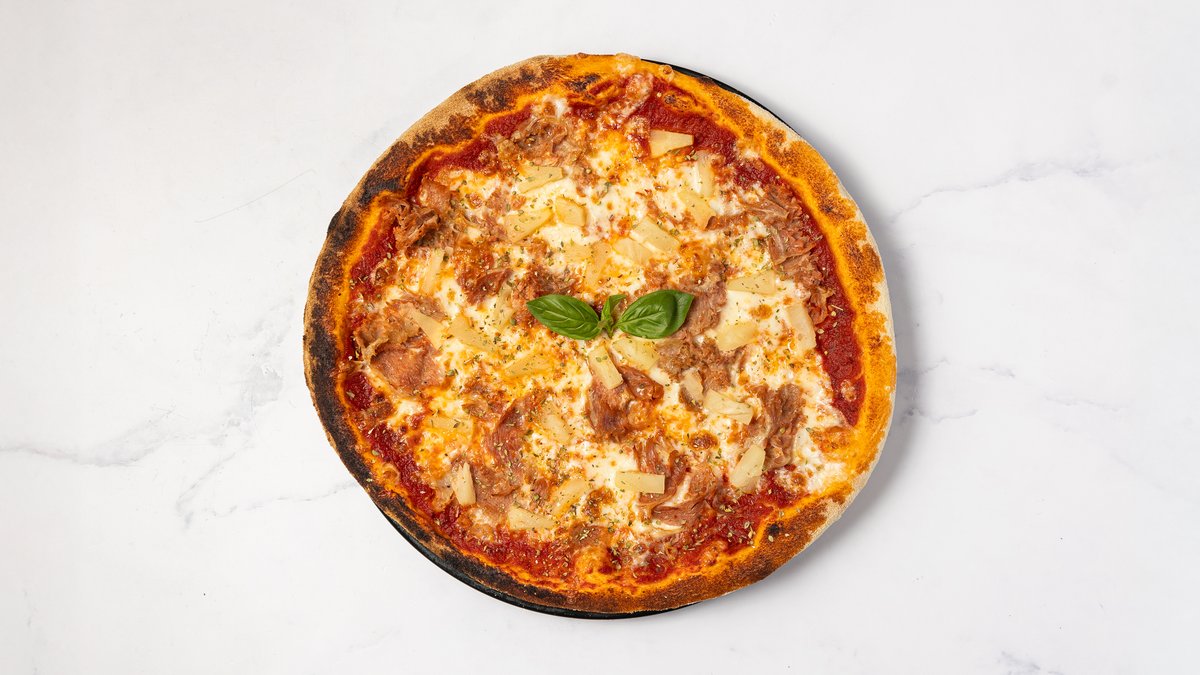 Tomatsauce, mozzarella, oregano, kalveskinke og ananas.