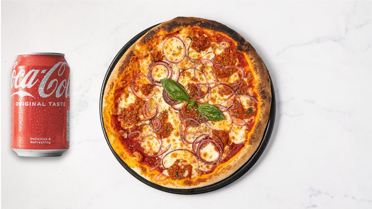 Vælg en pizze og få en valgfri sodavand med.