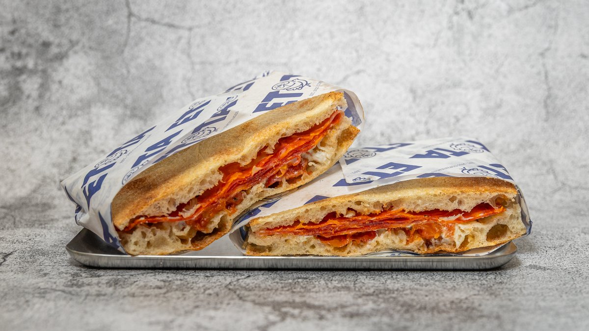Sandwich med fyld af stærk salami, bagt tomat, gorgonzola og stærk honning.