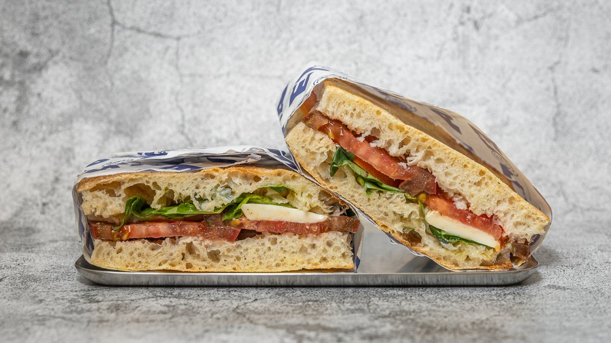 Sandwich med fyld af bøftomat, mozzarella og basilikum.