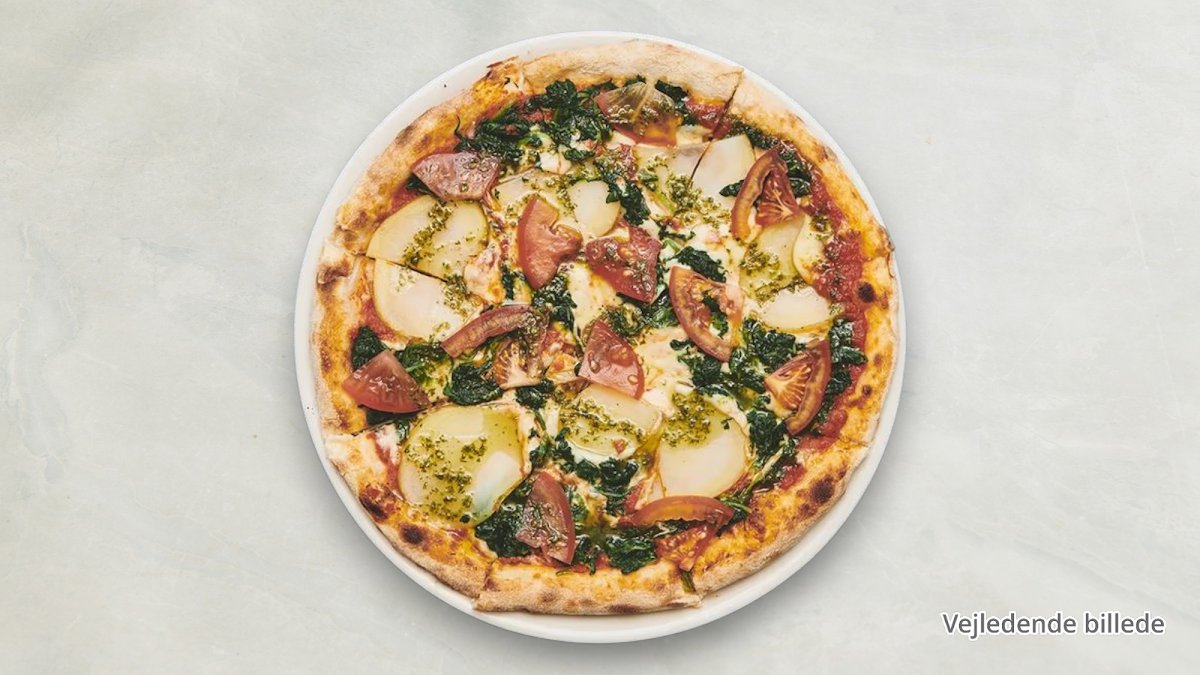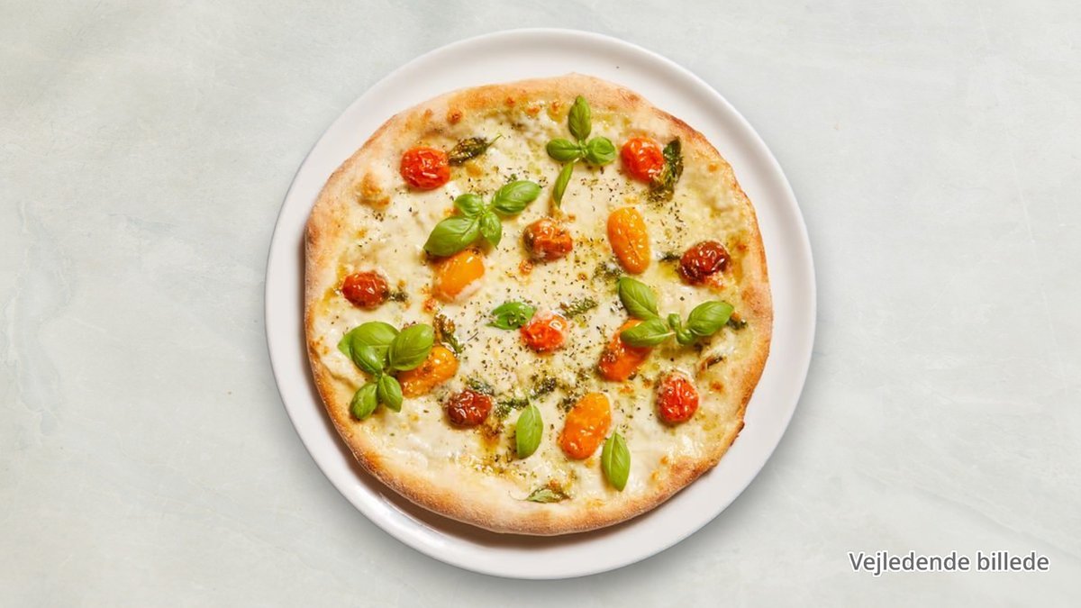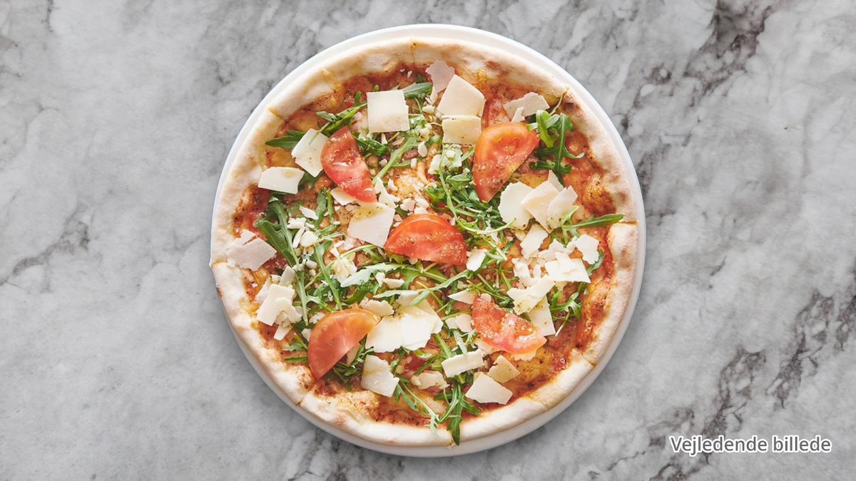 Tomatsauce, ost, frisk tomat, italiensk mozzarellaost, rucola og pestodressing.