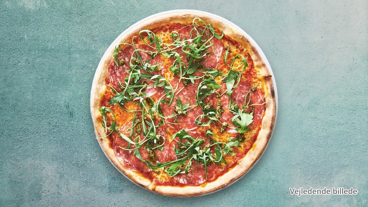 Italiensk stærk salami, rucola, parmesan og olivenolie.
