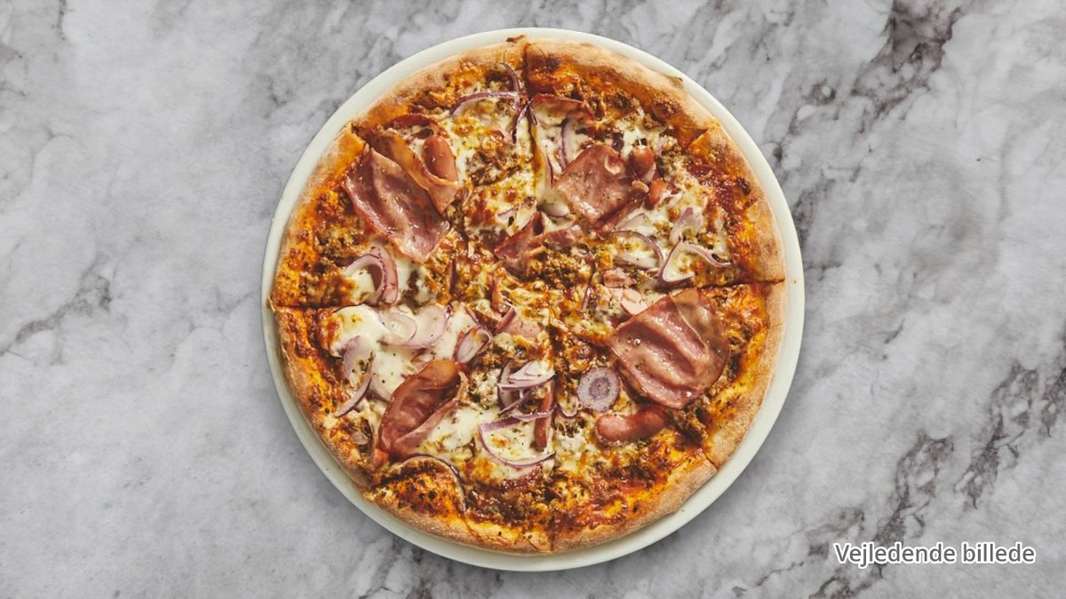 Tomatsauce, ost, pepperoni, kødsauce og bacon.