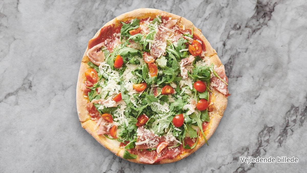 Tomatsauce, ost, parmaskinke, rucola og olivenolie.
