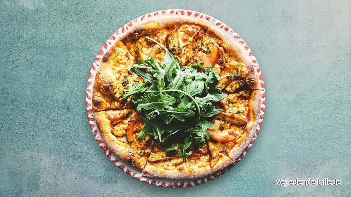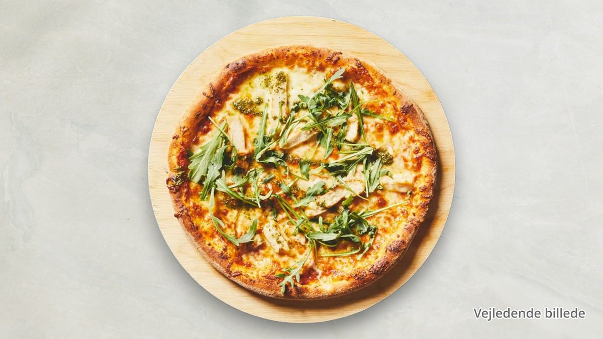 Tomatsauce, ost, kylling, frisk tomat, rucola og olivenolie.