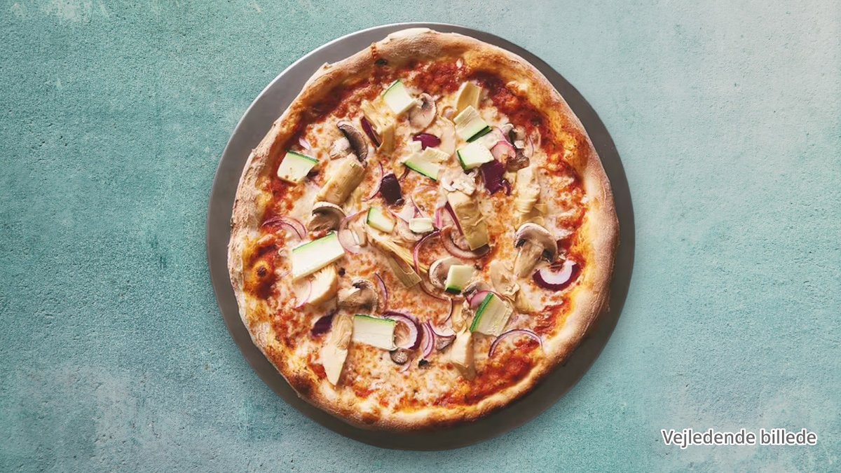 Tomatsauce, ost, champignon, løg, paprika, artiskokker og spinat.