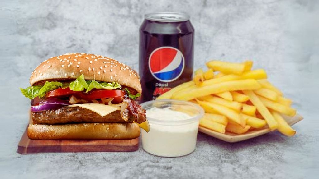 Burger med pommes frites, valgfri dip og dåsesodavand.