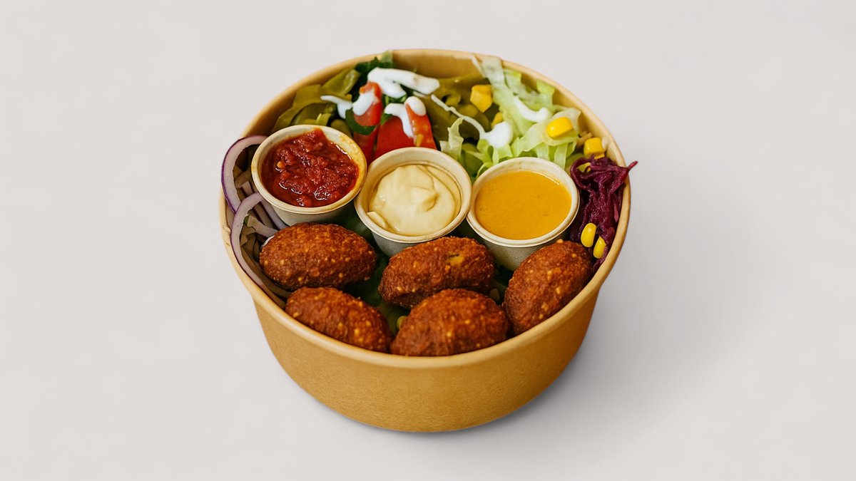 Box med valgfri protein, pommes frites, Salat, Tomat, Agurk, Hummus, Chilli , Rødløg, Syltede agurker og jalapeños.