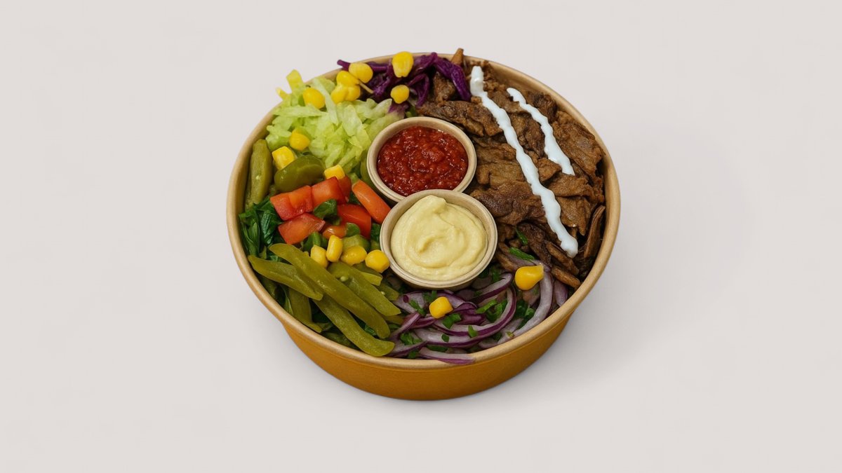 Grillret med valgfri protein, salat, tomat, agurk, hummus, chilli, rødløg, Rødkål, Majs Syltede agurker og jalapeños.