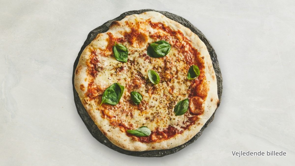 Tomatsovs, mozzarella og frisk basilikum. Kanten dryppes med ekstra jomfru olivenolie.