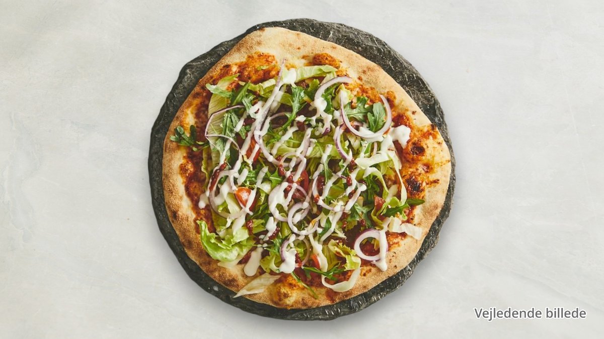 Tomatsovs, mozzarella, champignon, sorte oliven, shawarma, salat, rucola og cremefraiche dressing.