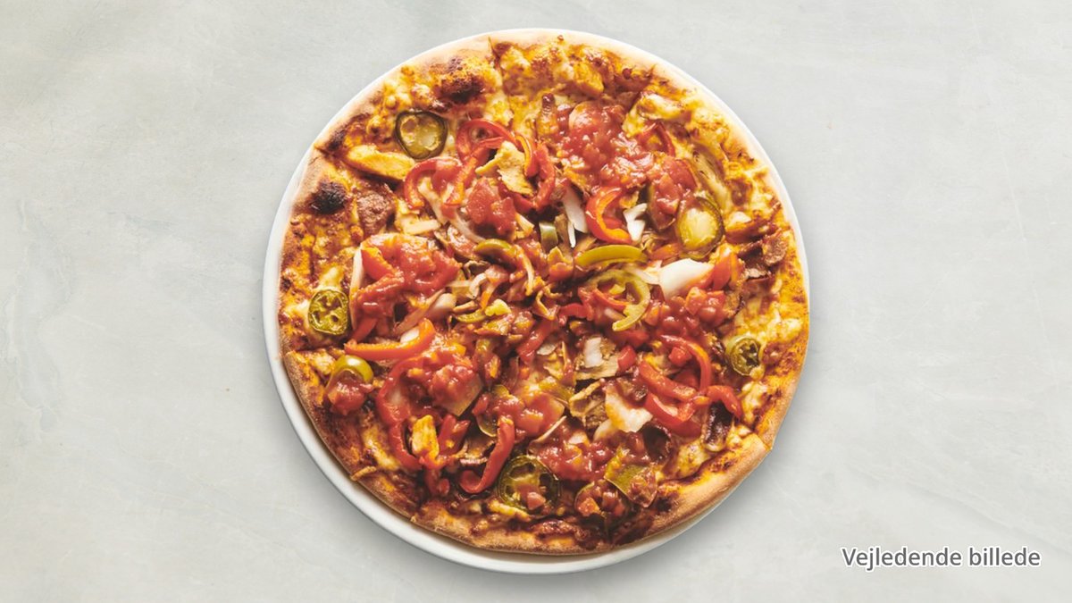Tomatsauce, chiliolie, mozzarella, tabascosauce, jalapeños, rødløg, kebab og chilliflager.