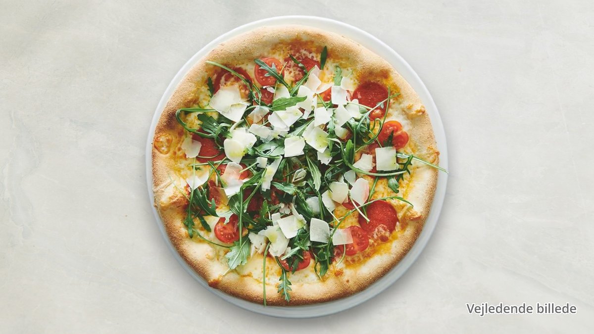 Tomatsovs, mozzarella, bresaola, rucola, grøn pesto, cherrytomater, sorte oliven og parmesan. Kanten dryppes med ekstra jomfru olivenolie.