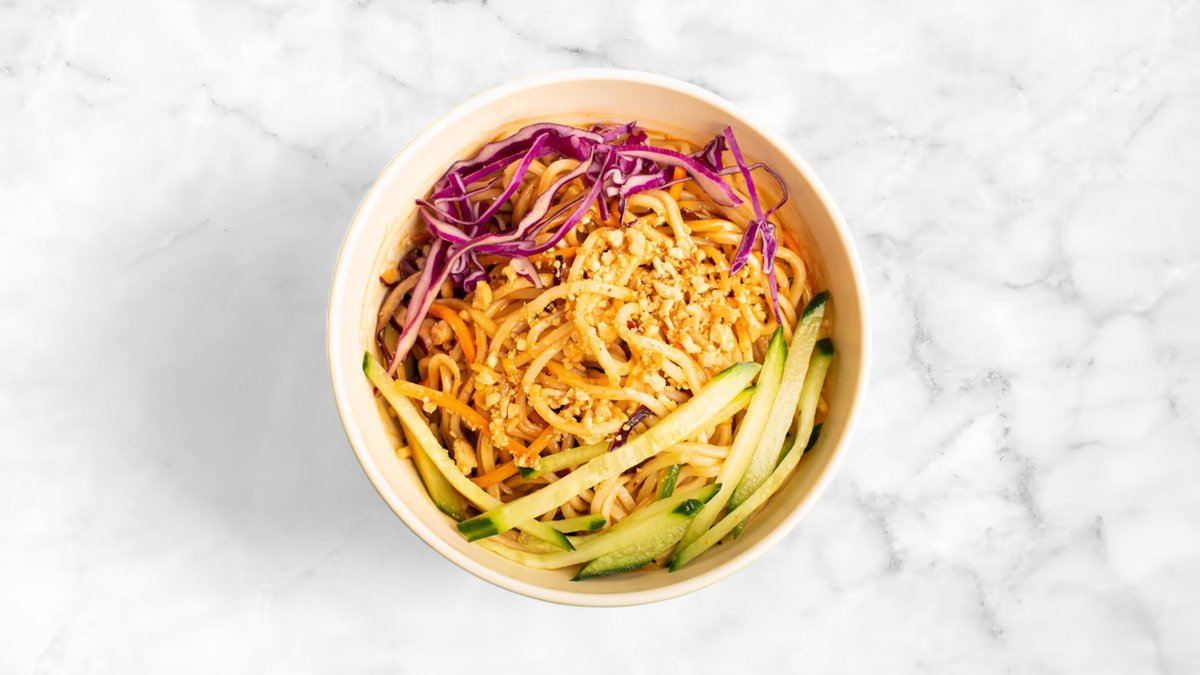 Varme nudler i spicy peanut sauce med agurk, forårsløg, syltede rødløg og knuste peanuts.