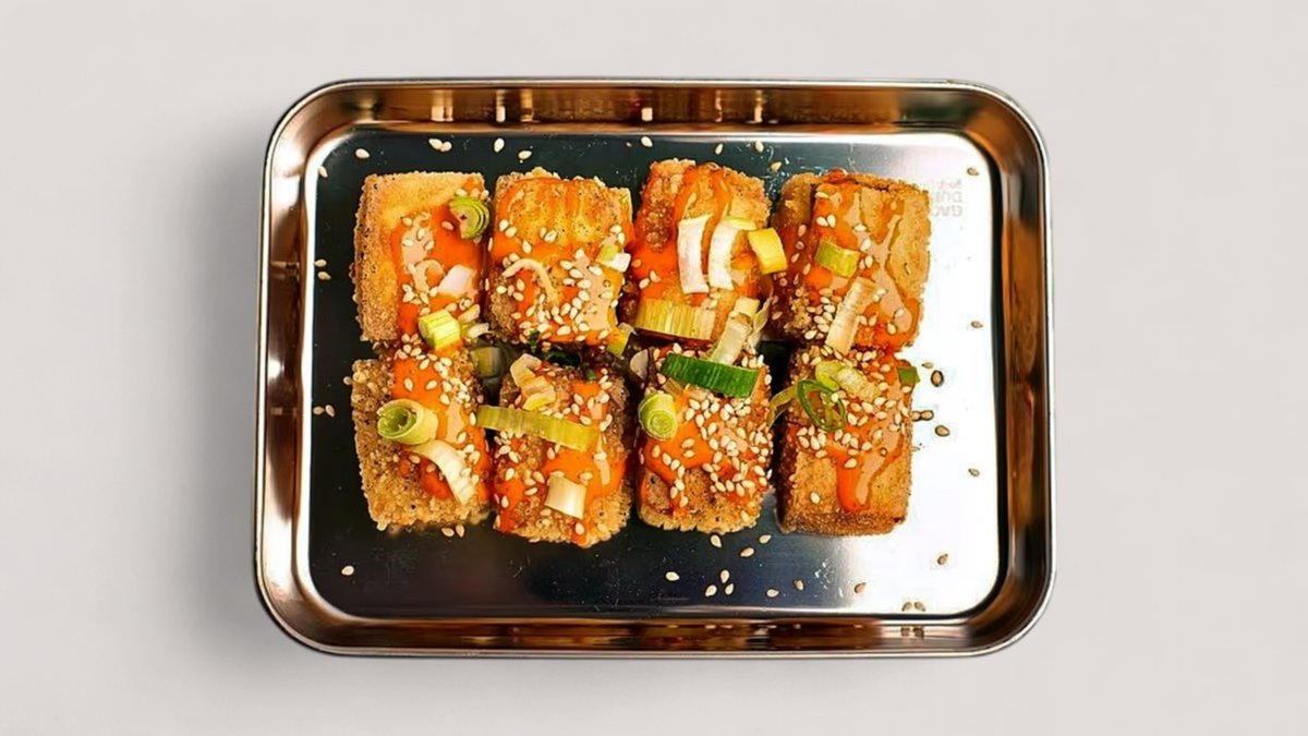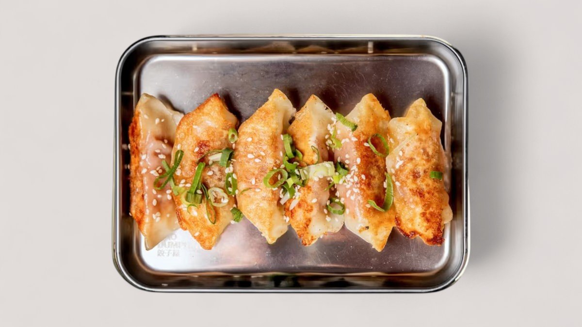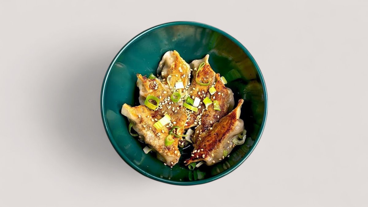 Fried gyoza filled with Beyond Meat and fresh napa kimchi. A vegan alternative with a spicy kick.