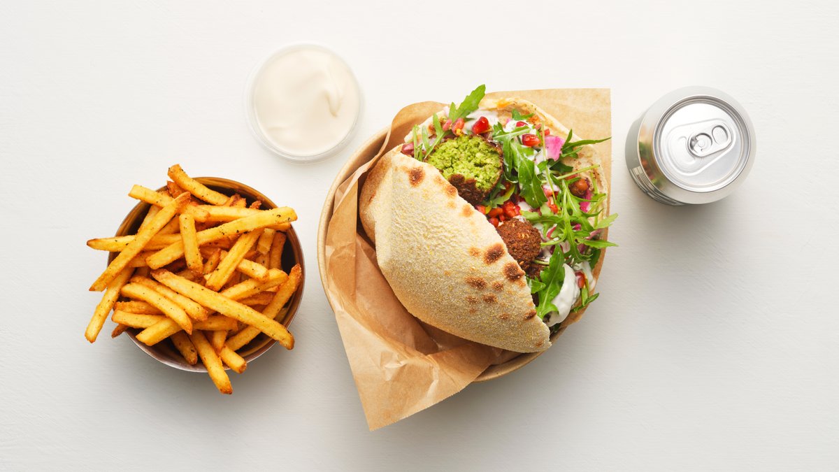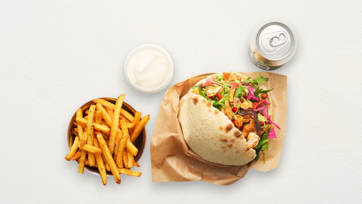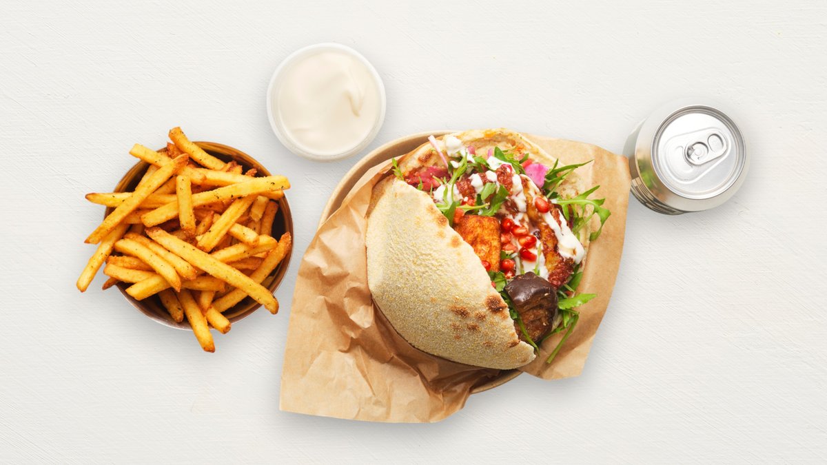 Bund af tzatziki og sæsonbaseret bulgur. Fyldt med salat, citronmarineret kål, syltede rødløg, ovnbagt aubergine og ristede kikærter m. za’atar. Toppet med rucola og granatæble. Serveret med urtedressing, fries og dip, samt en valgfri drikkevarer.