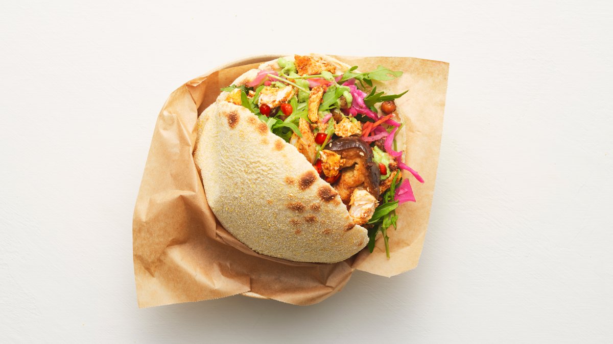Friskbagt økologisk surdejs pitabrød. Alle pitaer indeholder, citronmarineret kål, syltede rødløg, ovnbagt aubergine og ristet kikærter m. za’atar. Toppet med rucola og granatæble. Serveres med hummus og urtedressing