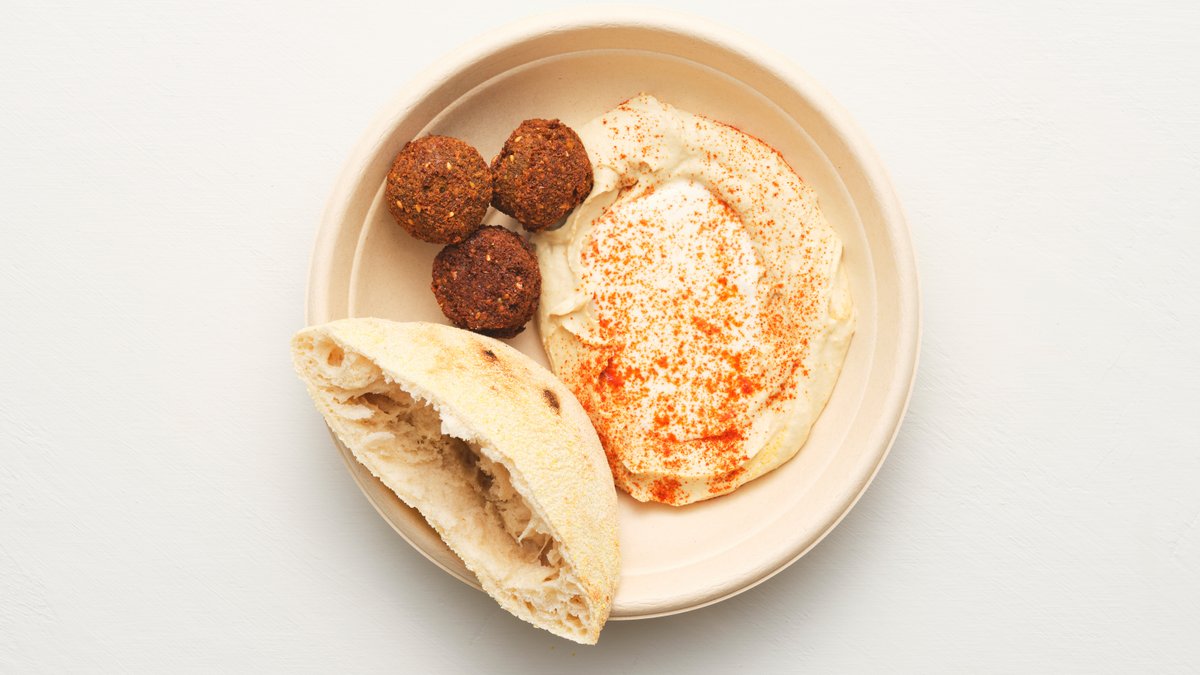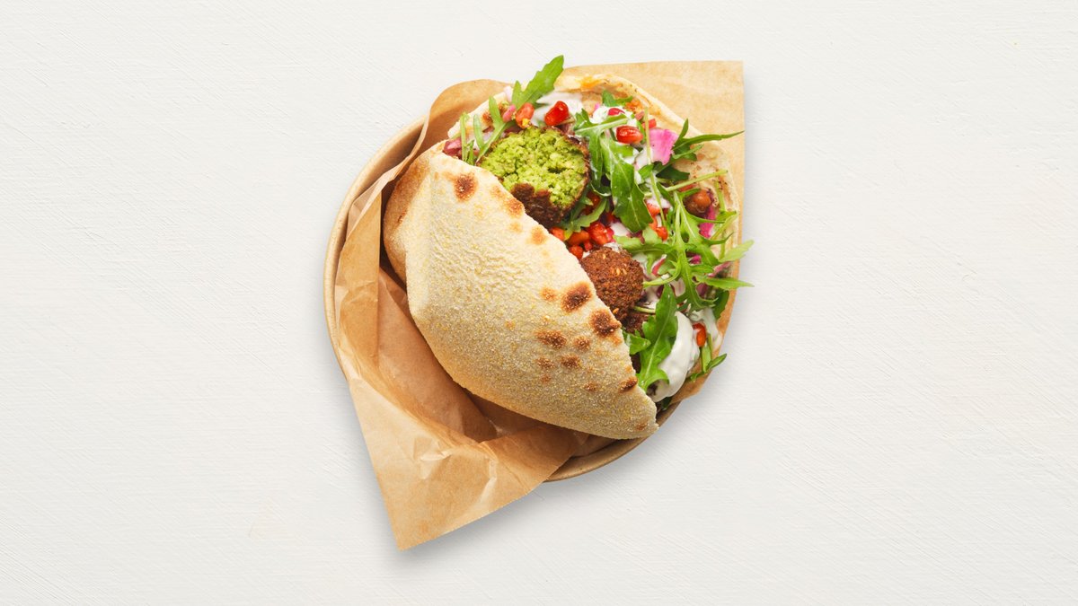 Bund af hummus og sæsonbaseret bulgur. Fyldt med salat, citronmarineret kål, syltede rødløg, ovnbagt aubergine og ristede kikærter m. za’atar. Toppet med rucola og granatæble. Serveret med tahini yoghurt og granatæble molasses, fries og dip, samt en valgfri drikkevarer.