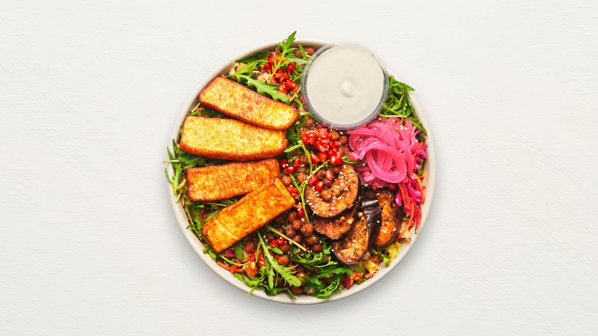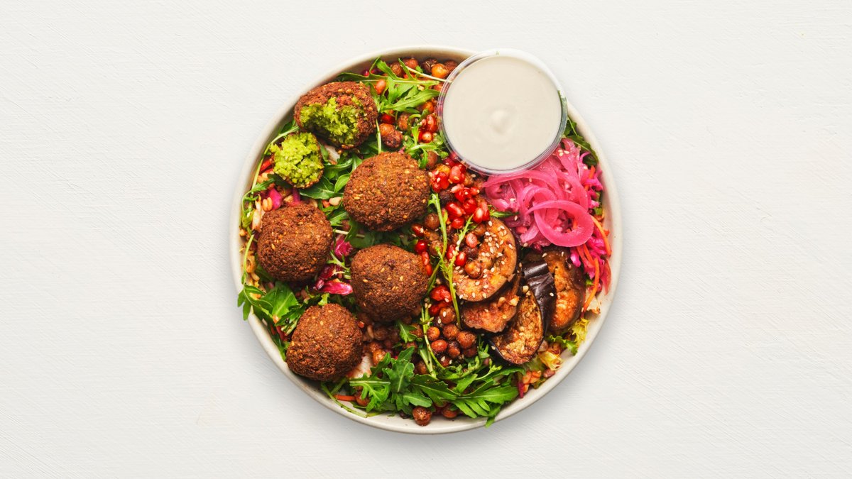 Bund af hummus og sæsonbaseret bulgur. Fyldt med salat, citronmarineret kål, syltede rødløg, ovnbagt aubergine og ristede kikærter m. za’atar. Toppet med rucola og granatæble. Dressing: Tahini Yoghurt og granatæble molasses