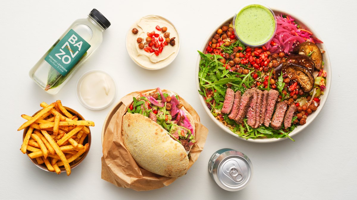 Bund af tzatziki og sæsonbaseret bulgur. Fyldt med salat, citronmarineret kål, syltede rødløg, ovnbagt aubergine og ristede kikærter m. za’atar. Toppet med rucola og granatæble. Serveret med urtedressing, fries og dip, samt en valgfri drikkevarer.