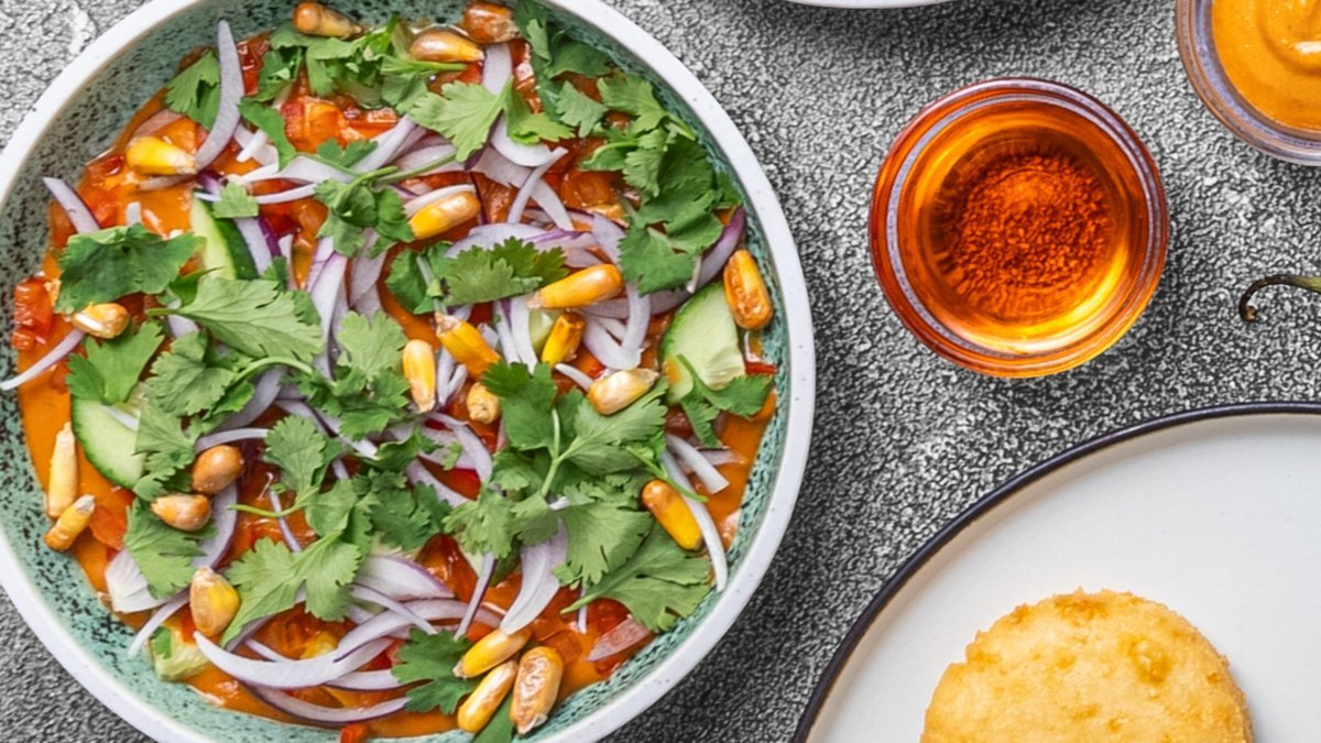 Traditionel latinamerikansk ceviche med hvid sæsonbestemt fisk, leche de tigre, chulpe majs