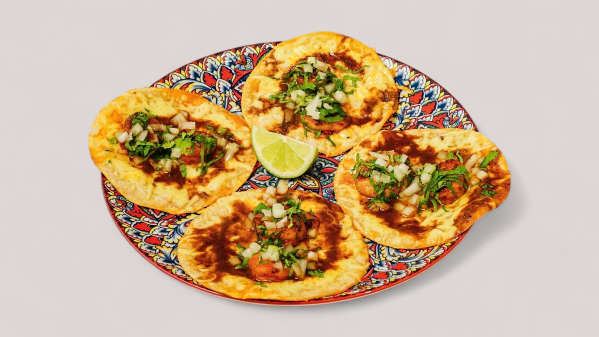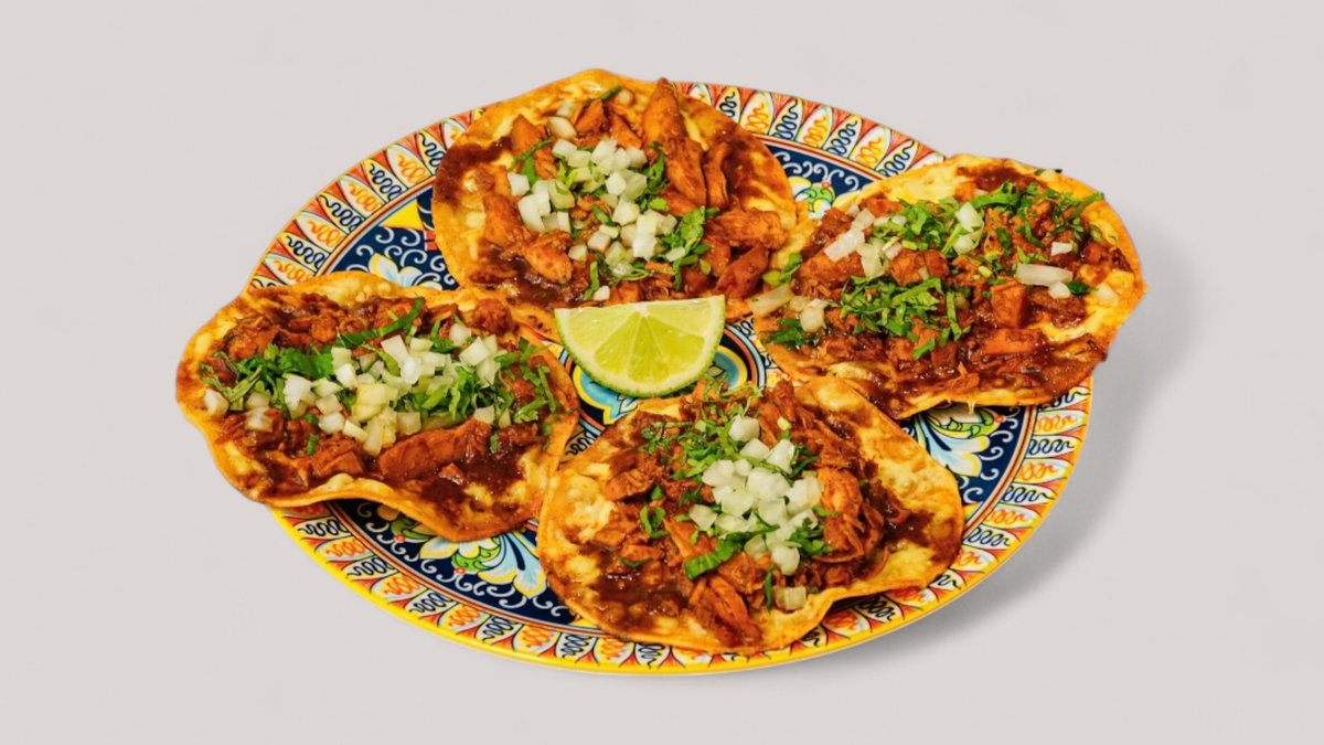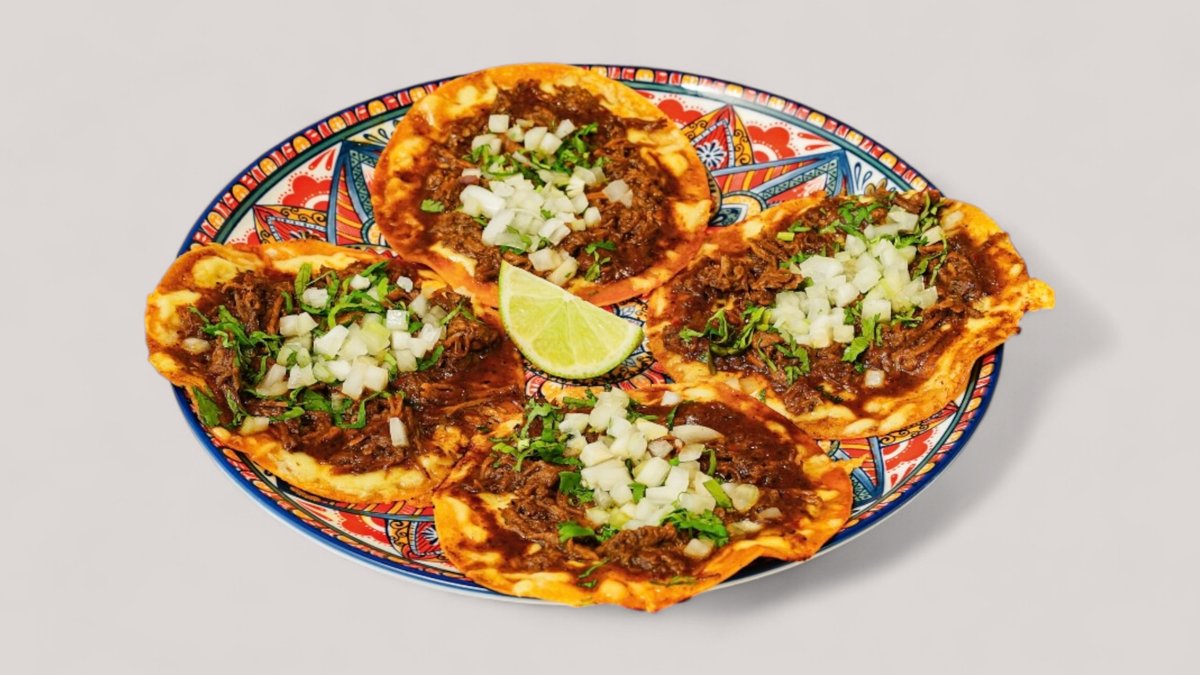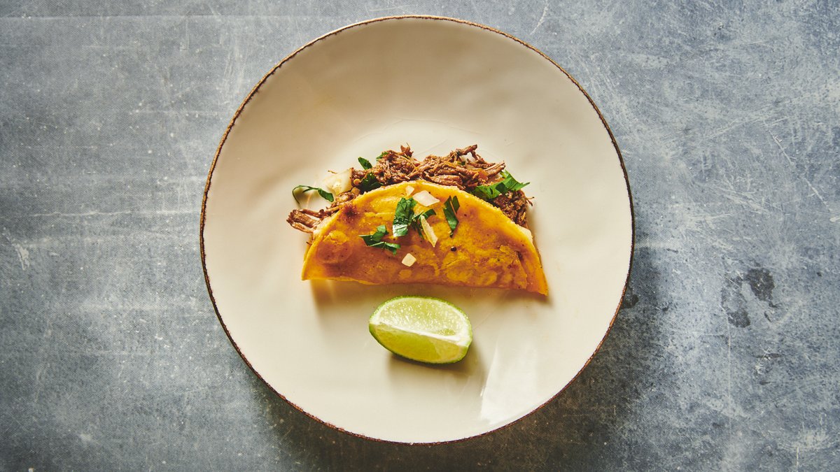 Langtidssimret oksekød marineret i krydderier og chili. Serveret på en tortilla med friskhakket løg, koriander, smeltet ost og en kant af lime.