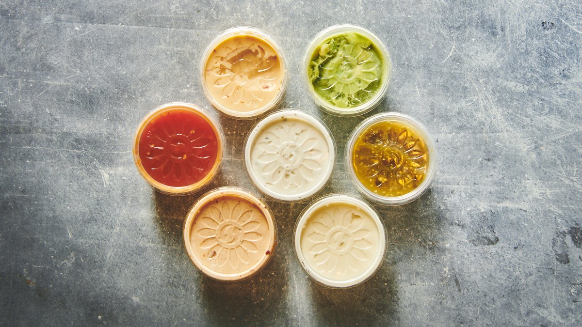 En samling af tre dips: rød, grøn salsa og creme fraiche.