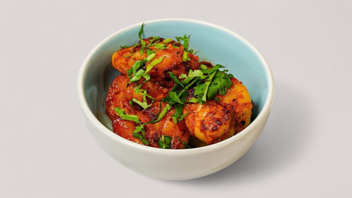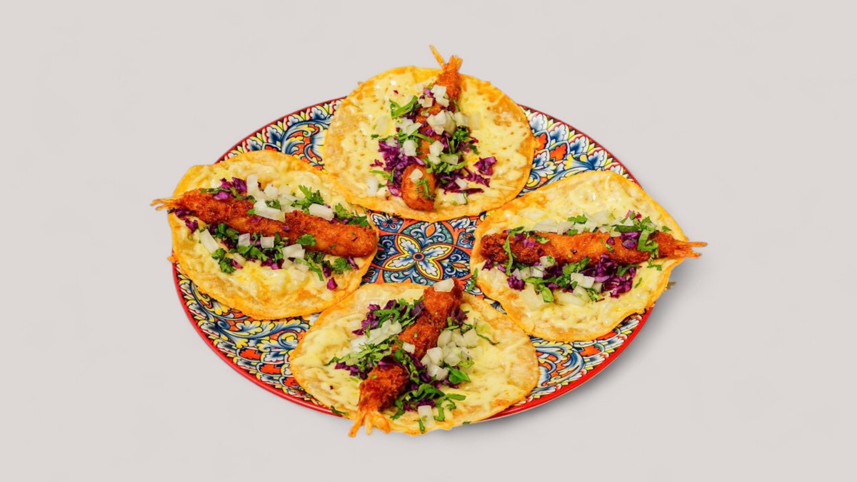 Vannamei-rejer krydret og sauteret med en blanding af krydderier serveret på en tortilla med frisk løg, koriander, smeltet ost og en kant af lime.