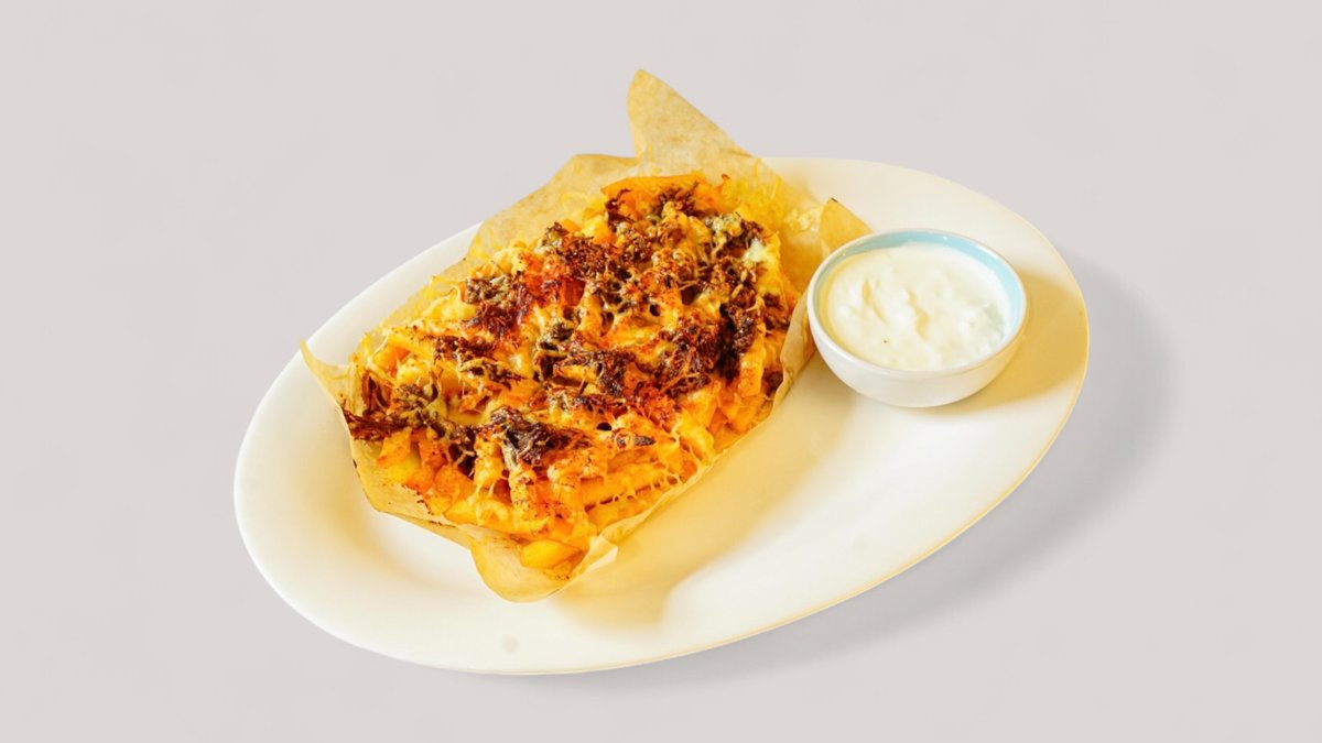 Pommes frites med langtidssimret oksekød, smeltet ost, og toppet med pico de gallo.