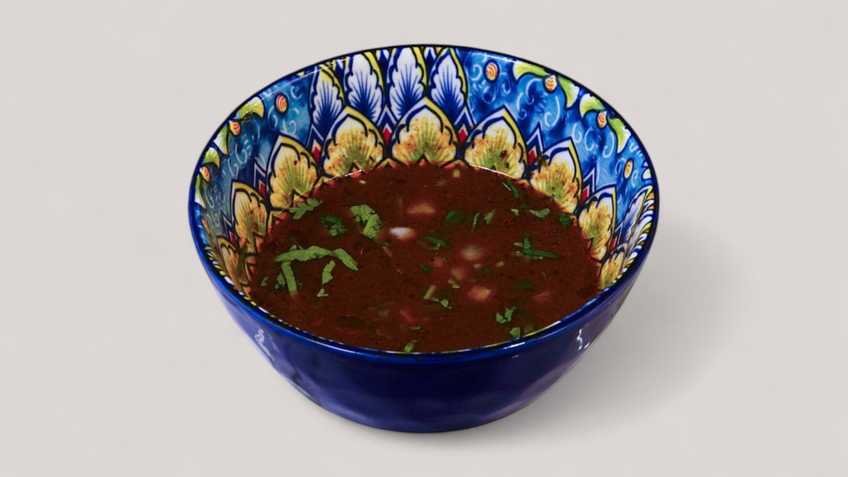 Rig birria-suppe med autentiske krydderier. Ideel til dipping af tacos eller som varmende suppe med koriander og løg.