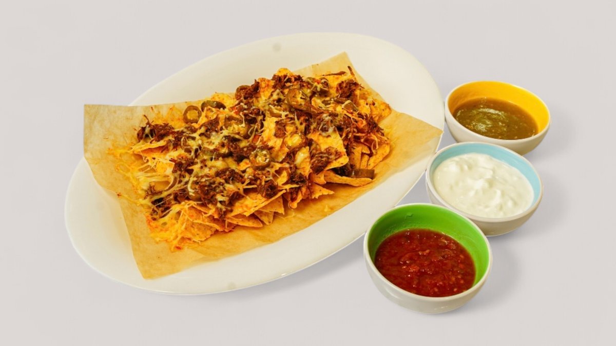 Nachos med smeltet ost, jalapeños, koriander og valgfrit protein. Serveres med rød & grøn salsa, samt creme fraiche.