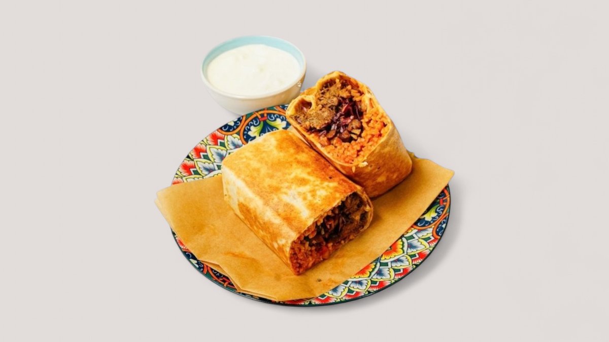Langtidssimret birria-oksekød, ris, bønner, pico de gallo, rødkål og smeltet ost.