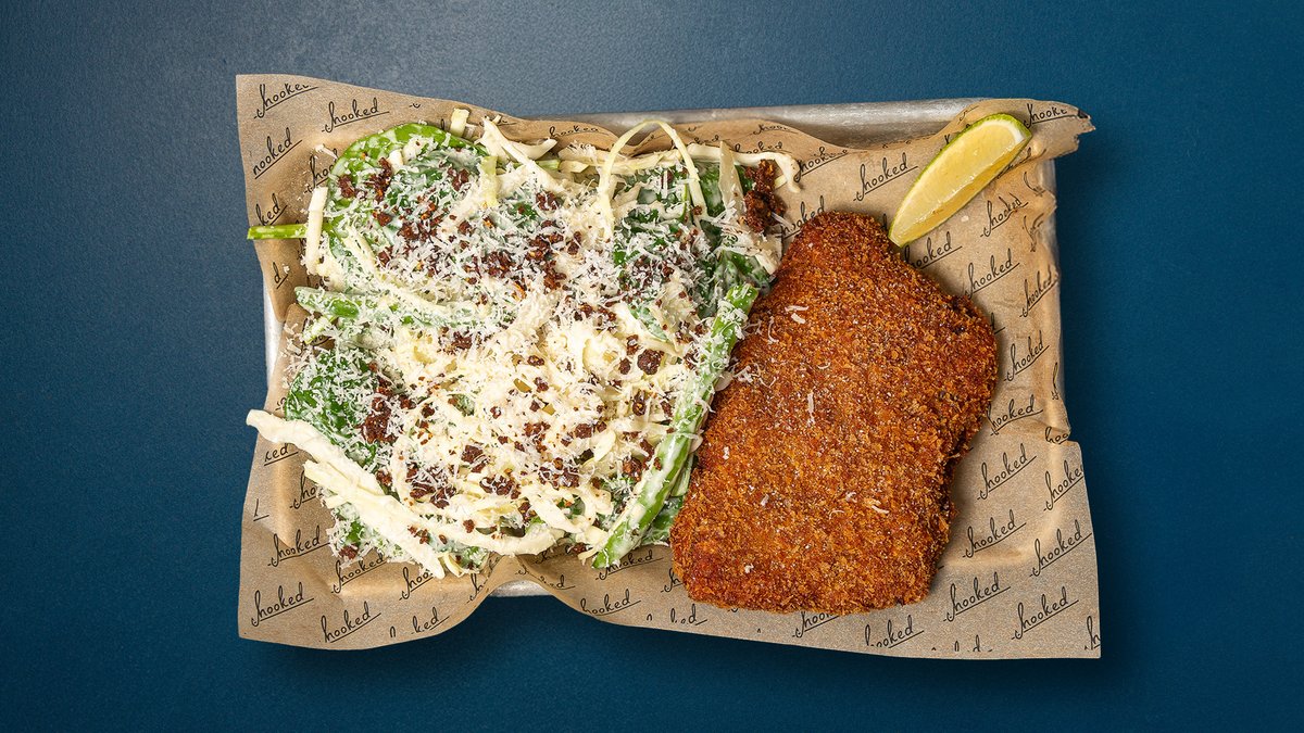 Friteret mørksej i Hooked krydderier, grøn salat, grønne bønner, cæsardressing, parmesan, & rugbrødsknas