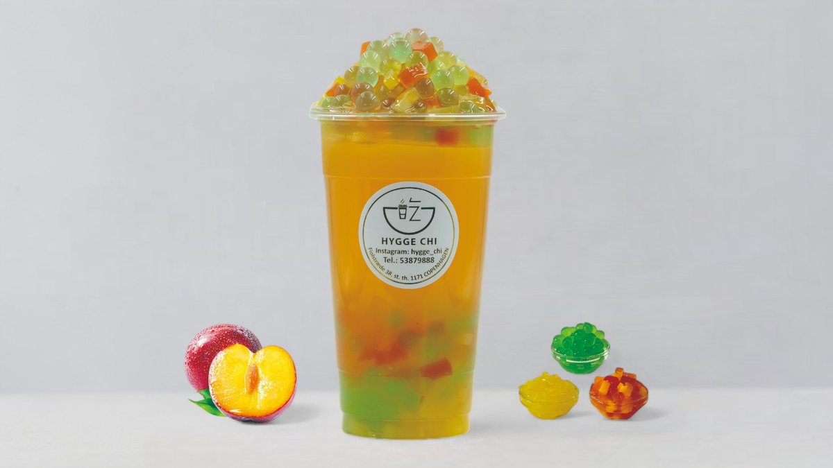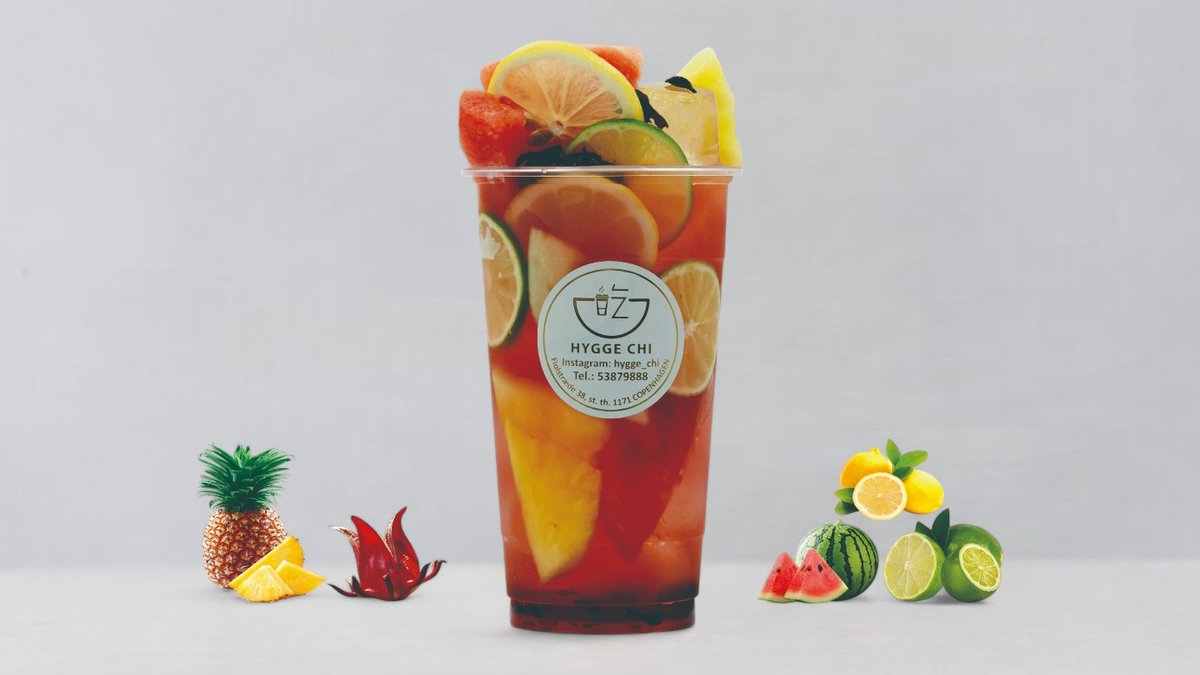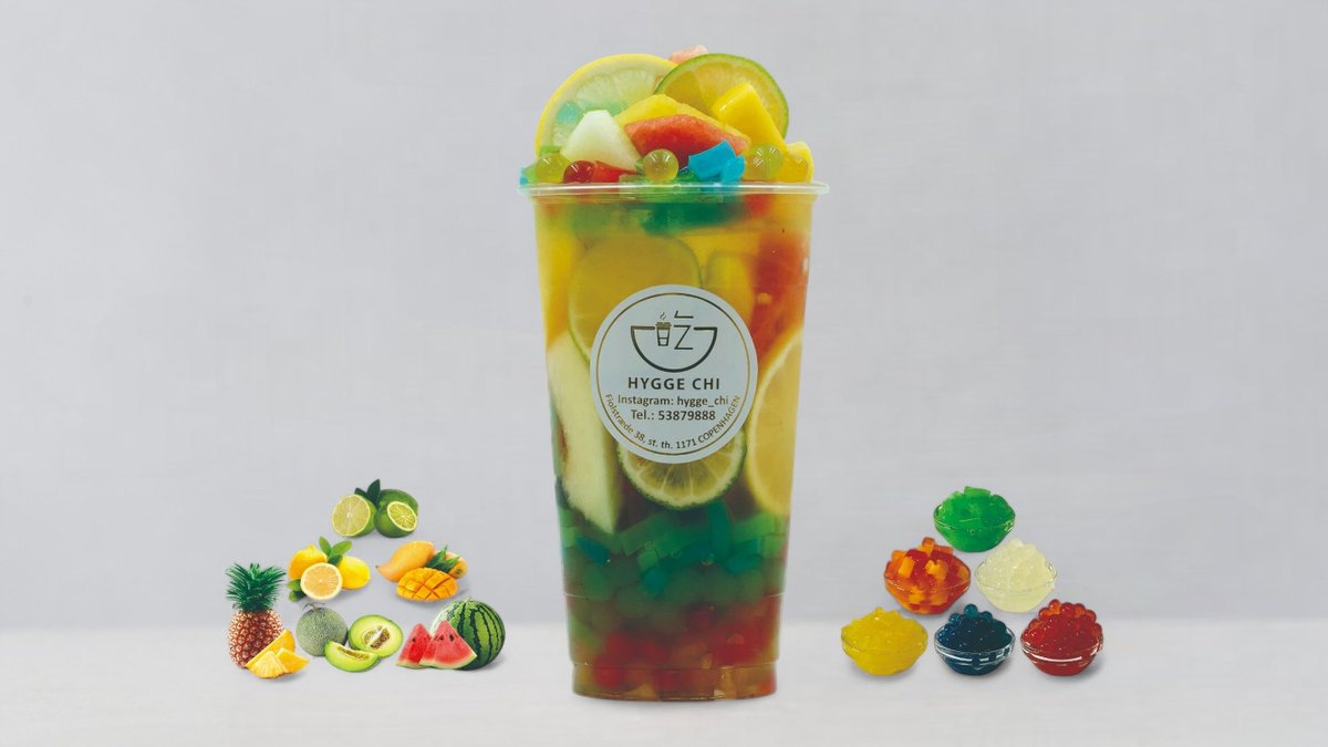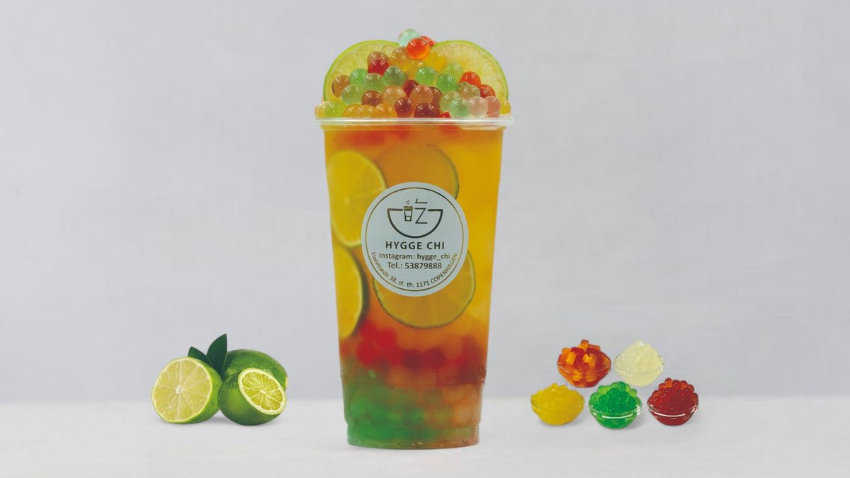 Kold drik lavet på friske sæsonbaserede frugt, øko lime, øko citron, grøn te og sukker. Serveres med op til 6 valgfri boba.