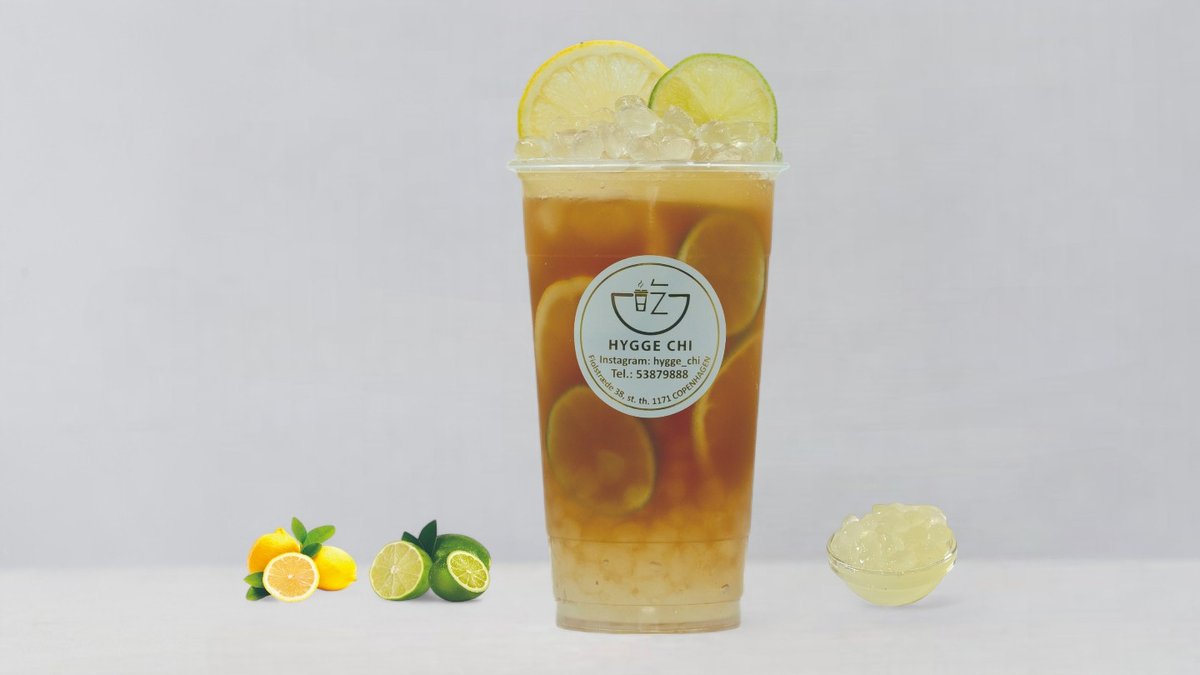 Kold drik lavet på frisk øko citron, appelsin, grøn te og sukker. Serveres med 5 valgfri boba.
