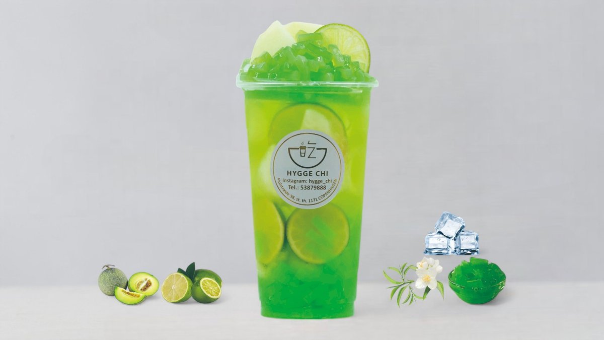 Kold drik lavet på frisk øko lime, frisk honningmelon, jasmin grøn te, sugar og grøn æble jelly.