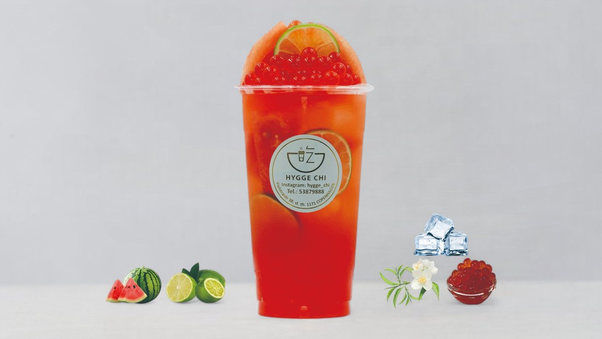 Kold drik lavet på frisk vandmelon, øko lime, grøn te og sukker. Serveres med vandmelon boba.