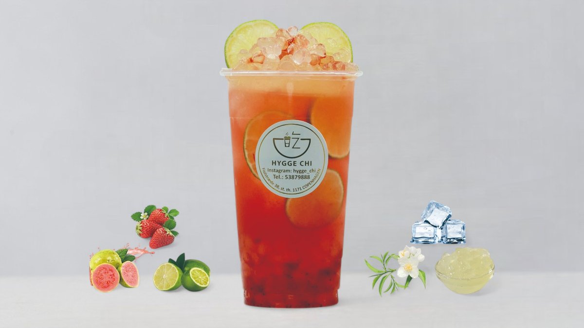 Kold drik lavet på øko lime, guavajuice, jordbærjuice, jasmin grøn te, sukker og magic ball.